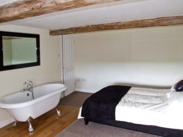 Two bedrooms: 1 x double with en-suite shower, basin and WC, 1 x double with roll-top bath. Separate basin and WC. Kitchen with dining area. Sitting room (seats 3) with woodburning stove.