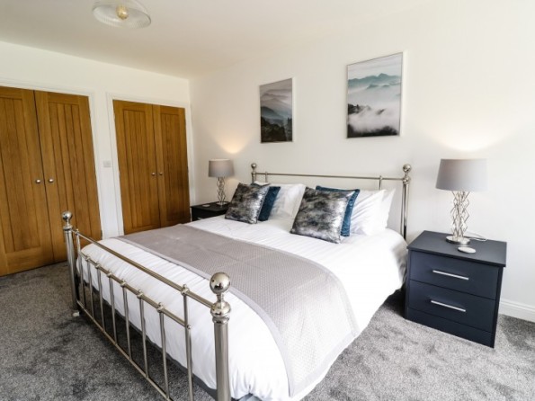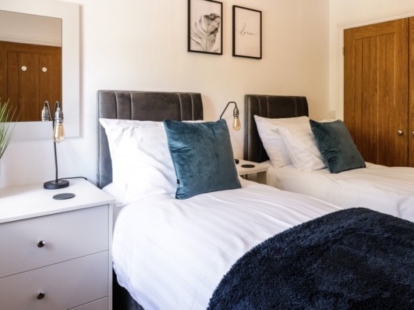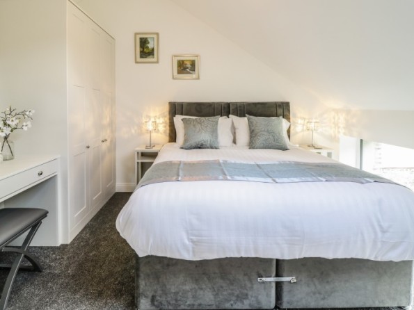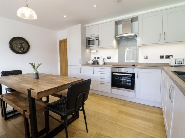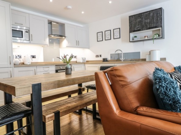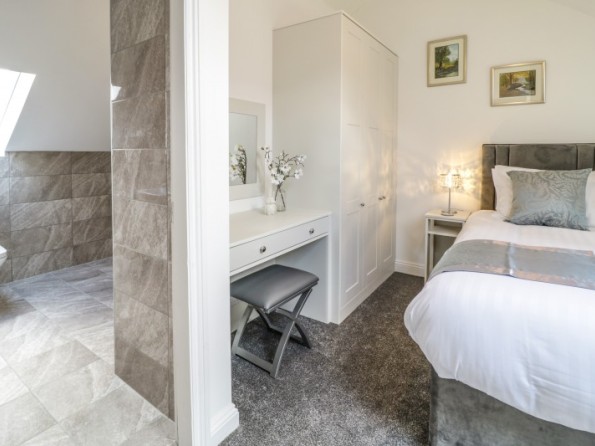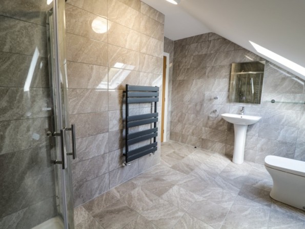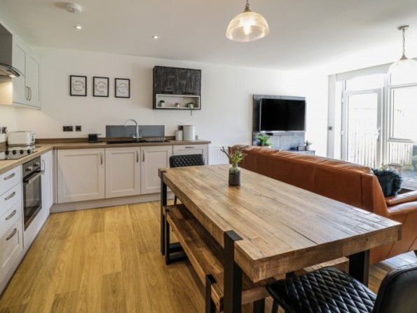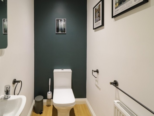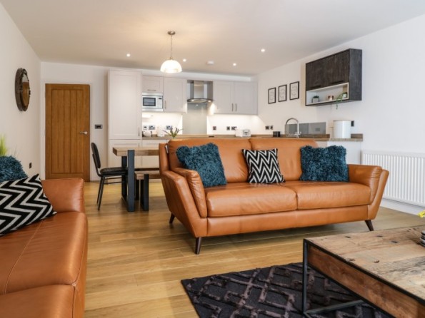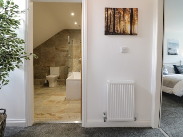 Over three floors. Three bedrooms: 1 x super-king-size with Smart TV and sitting area, 1 x second-floor king-size (zip/link can be 2'6" twin on request) with Smart TV and en-suite walk-in shower, basin, heated towel rail and WC, 1 x ground-floor twin with Smart TV. Bathroom with bath, shower over, basin, heated towel rail and WC. Cloakroom with basin and WC. Open-plan living space with kitchen, dining area and sitting area