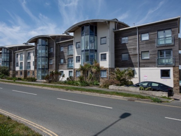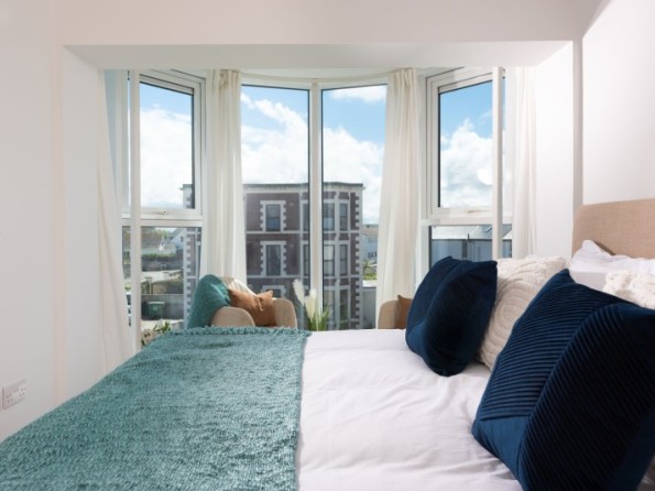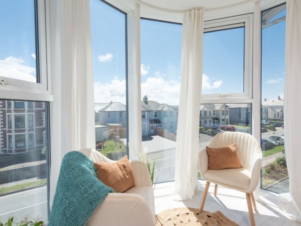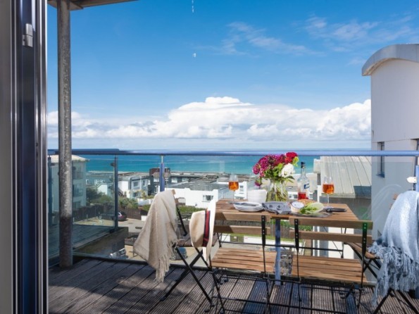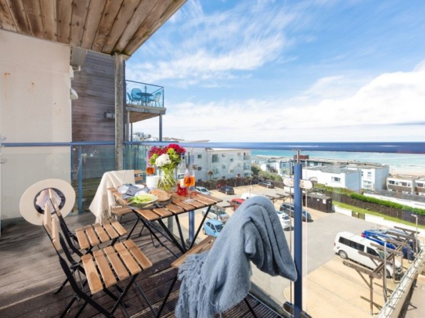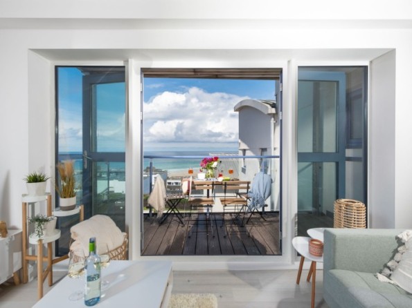 The balcony is accessed through French doors leading out from the living area with glass balustrade and wonderful sea views of Fistral and north Cornish coast to Trevose Head. This area is furnished with a table and four chairs.