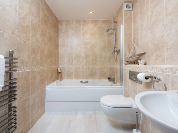 This bathroom has a bathtub and shower over, basin, W/C, heated towel rail, mirror, hairdryer and shaver point