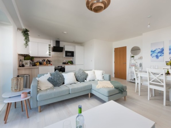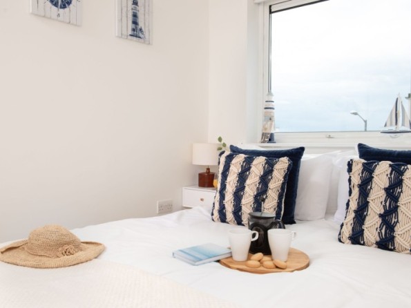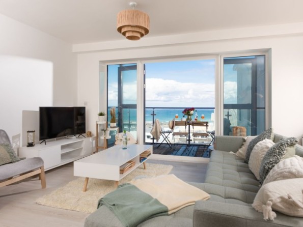 This room is open plan with the dining area and kitchen and has a large L-shaped sofa, two armchairs, a coffee table, side tables and a TV cabinet with a flat screen Smart TV. French doors lead out to the furnished balcony which has excellent views over Fistral Beach