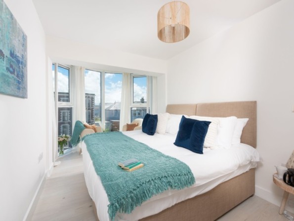This bedroom also has a large bay window with floor to ceiling glass and is furnished with a king size bed, freestanding wardrobe, chest of drawers, mirror, bedside tables and lamps