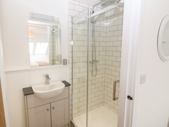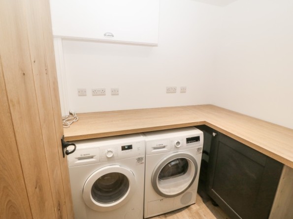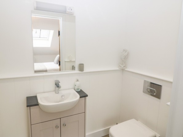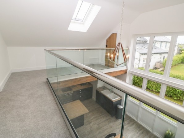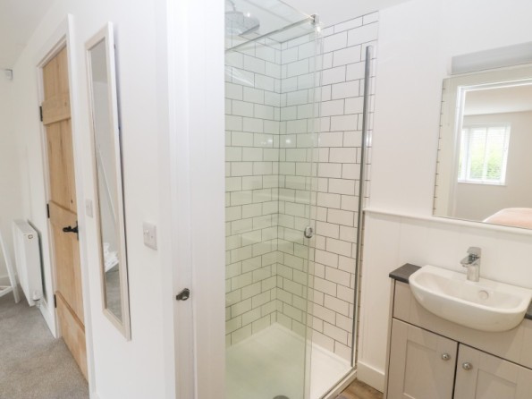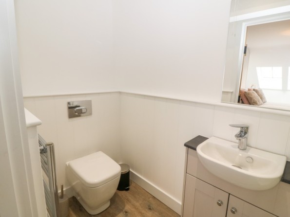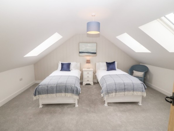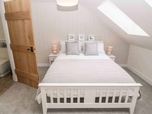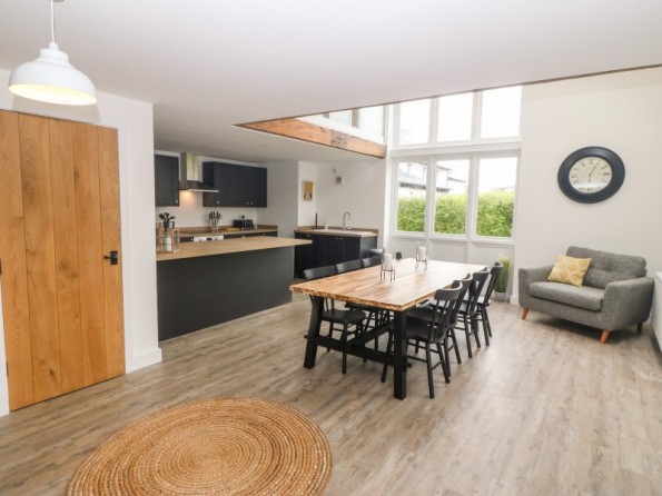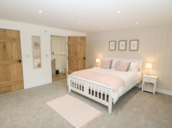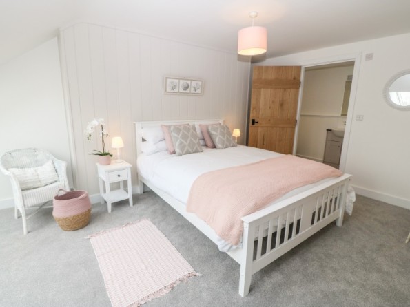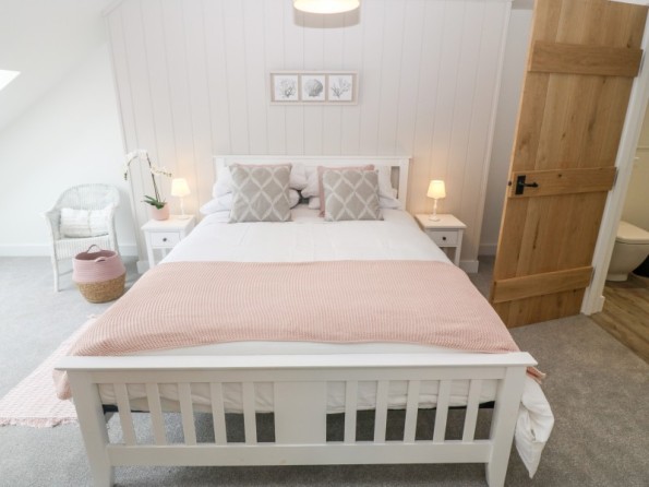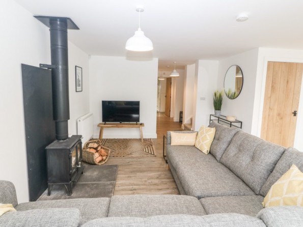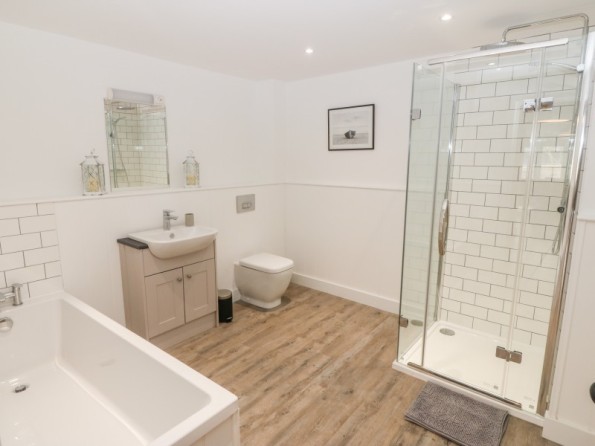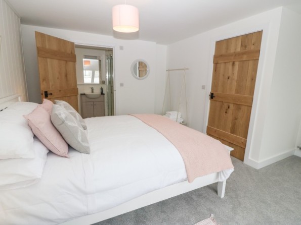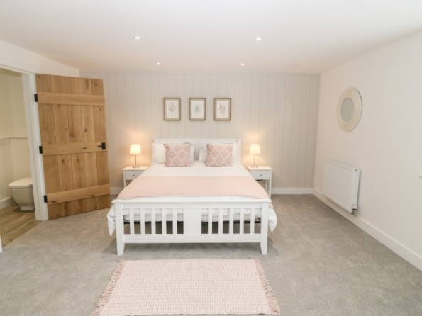 Over two floors. Four bedrooms: 1 x king-size with en-suite walk-in shower, basin, heated towel rail and WC, 2 x king-size with en-suite walk-in shower, basin, heated towel rail and WC, 1 x twin. Bathroom with bath, shower over, basin, heated towel rail and WC. Cloakroom with basin and WC. Open-plan living space with kitchen, dining area and sitting area with woodburning stove. Utility