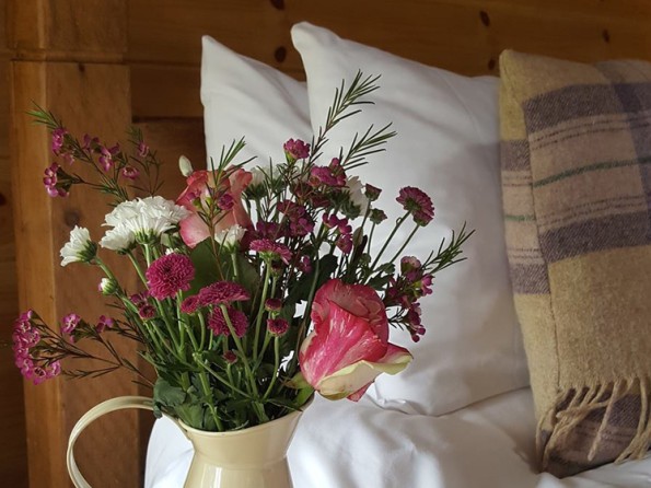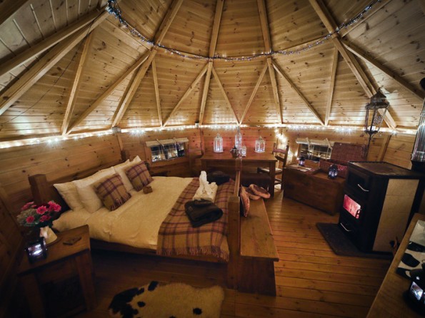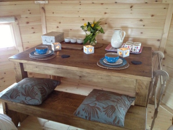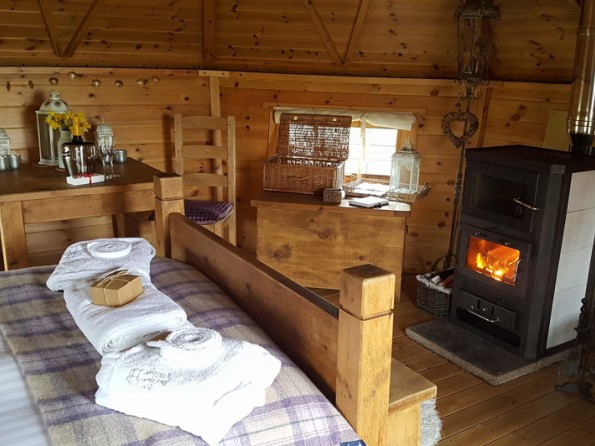 Bilberry is a cosy couples retreat, in the style of an arctic cabin and dressed with British wool and tartan throws. It has a handmade rustic double bed with feather down duvet and luxury cotton bedding and a large wood burning stove oven to keep you warm and to cook on. It also has a private eco loo. The washrooms with flushing loos and wetroom style shower rooms, wood fired sauna and ‘Shepherds Rest’ our wellness treatment room are all just a short stroll away. Towels, cookware and crockery are provided.