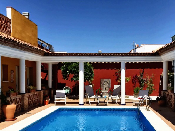 Casa Uno is a very private colonnaded villa in Andalucia with a private swimming pool in a small hill-top inland village. It offers you all the convivial pleasures of Mediterranean courtyard living which Spain inherited from the Romans and the Moors. Brilliantly sunlit patios, deeply shaded eating areas, covered walkways to all rooms and a fountain murmuring under the bougainvillea.