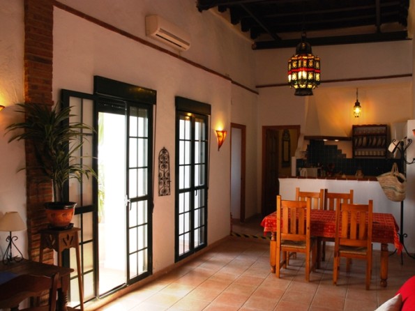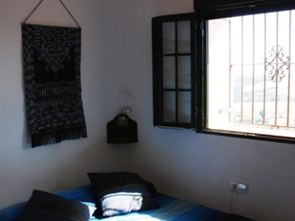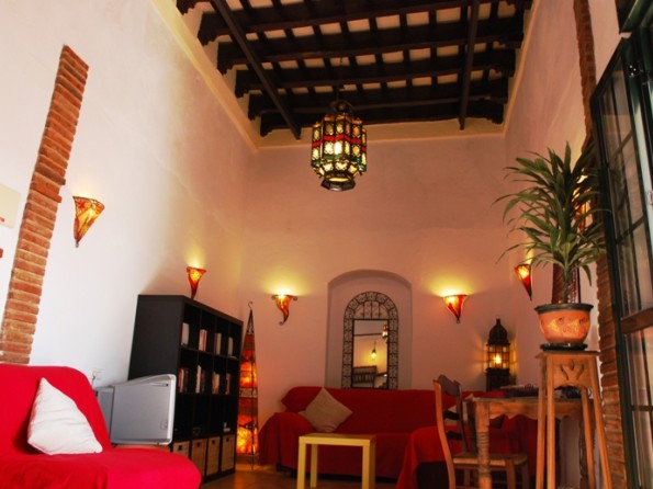 There are 2 bedrooms, one double, on the ground floor & one twin, accessed via a short sprial staircase and there is a single sofa-bed in the sitting room. We can also provide a cot for a baby. Both bedrooms are equipped with fans in the summer & ceramic wall heaters for the winter months. Completely refurbished, the bathroom has a large walk-in shower, loo & basin with drawers & storage, as well as an electric towel rail, useful in the winter months for keeping you warm and your towels dry! The living area is simply stunning: airy & spacious with a comfortable sitting-room area, dining room and kitchen, it also benefits from air-com which doubles as a heating unit in winter. The drama of the room is enhanced by four metre high ceilings and original oak beams from which hang two huge Moroccan lanterns. The interior is simple, stylish and comfortable, with hints of Al Andalus. Wifi is available in nearby establishments, 2 mins walk away.