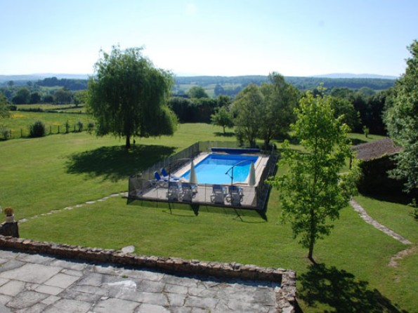 The kitchen dining area opens through double doors onto a South facing sheltered patio area with Weber Barbecue and solid teak dining set. Two adult and two children’s bikes are also available free of charge. The property is set in an acre of private landscaped grounds with far reaching views of the Morvan National Park (French Lake District). The heated pool is fitted with AFNOR child safety fencing.