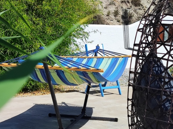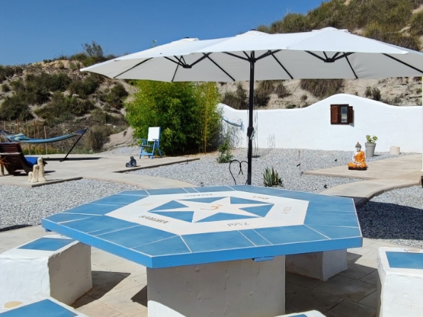 The outside space is extensive. In the rear garden area there’s a wood fired hot tub as well, with some separate seating and an outdoor shower. There’s a gas BBQ and a large table and benches for eating outside. Enjoy shady seating on the chairs under the pergola, relax on a sunbed or lounger, or lounge in the double sized hammock. Also in the garden is an outdoor table tennis table, a badminton net and a petanque court. The owner is able to offer you an archery lesson on site! At the front of the cave there’s a raised front patio with table and chairs, easily accessed from the kitchens and a great place to watch the sun rise. There’s a swing seat, as well as two rooftop terraces with sunbeds (and one with a table and hammock too). The owners have a Celestron telescope which they’ll happily set up so you can enjoy the stars and planets in the clear night skies. There’s an excellent village swimming pool just a few minutes’ drive away which is open in July and August.