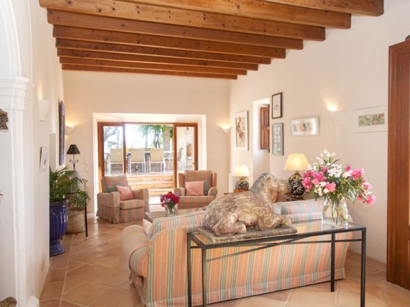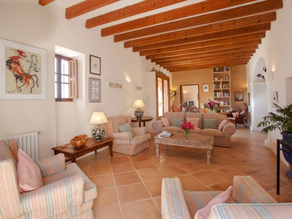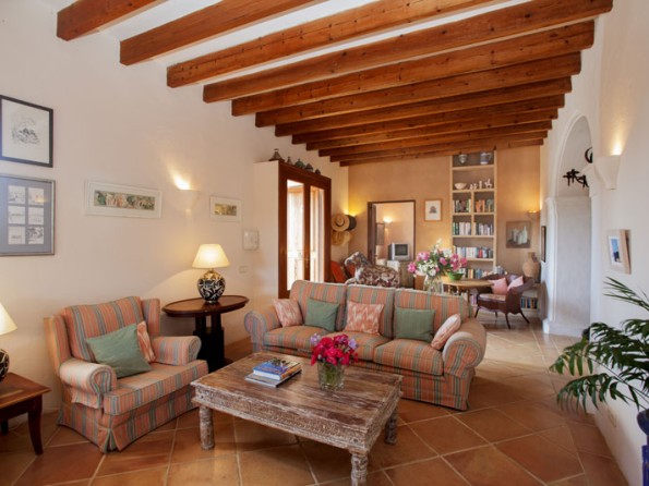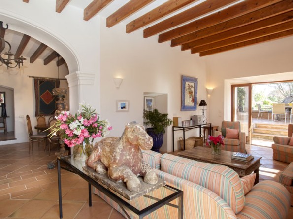Es Pins sleeps ten in three doubles and two twins, and it features antiques, ancient wood beams, thick stone walls and spacious cool interiors throughout. All of the bedrooms have ceiling fans and en-suite bathrooms, there is a fully fitted farmhouse kitchen and the large lounge/dining room with its old beamed ceiling has a table to seat 10 and a separate area with a sofa and easy chairs. From here you can access the terrace. The living space is well equipped with a music system, CDs, and books, and there is also an elegant music room with an original tiled floor, a satellite TV/DVD player and doors leading to the patio.