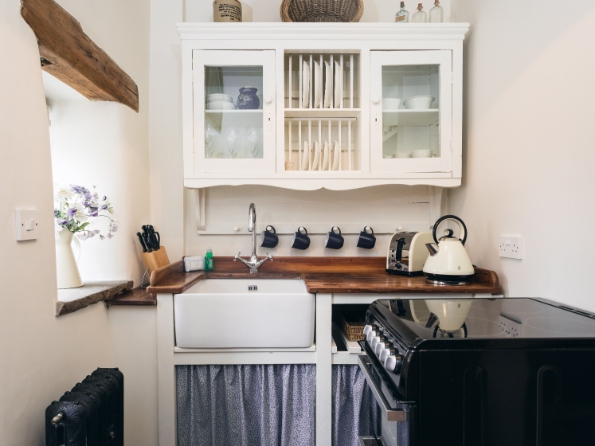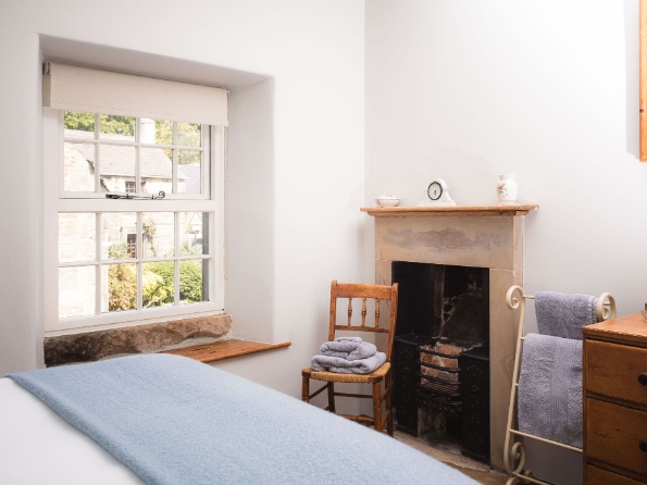 The cottage has one bedroom with a double bed, wooden floorboards and a decorative original stone fireplace, as well as an adjacent shower room. The living room features a working cast iron range fire, a stone flagged floor and exposed wooden beams. It includes a dining table with seating for two, a sofa, a digital flatscreen TV with Freeview and inbuilt DVD player. The kitchen, which opens directly onto the patio and enclosed garden, has an electric cooker, a refrigerator with ice box, a microwave, a toaster and kettle and an iron and ironing board, as well as all the necessary crockery, cutlery, glassware and cooking utensils.
