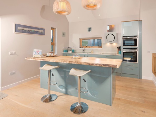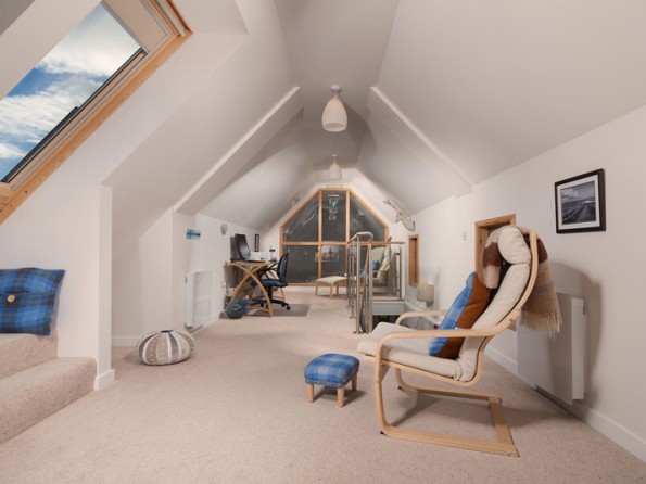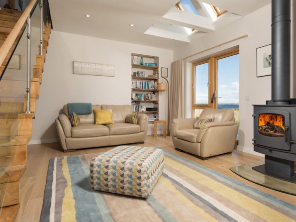 With its double-height living area, two large bedrooms, two bathrooms, relaxation area with balcony and office zone, this is a house with serious style and space credentials. Downstairs, the open plan living/dining/kitchen area has large windows and glass doors that seamlessly connect inside with out. In the centre of the kitchen/dining area stands an island unit with a unique worktop hand-crafted from local, storm-felled beech trees and the kitchen area is well stocked with everything from a dishwasher to a wine chiller to make eating in a pleasure. Bedrooms face south to make the most of the views - the master suite has a super king bed and a wet-room style en-suite and the second bedroom (super king or twin) sits across from a bathroom with a separate bath and shower. Under floor heating keeps oak floors warm underfoot, a multi-fuel stove keeps you cosy even in the wildest weather, and the house is equipped with broadband and WiFi as well as LCD smart TV and music systems.