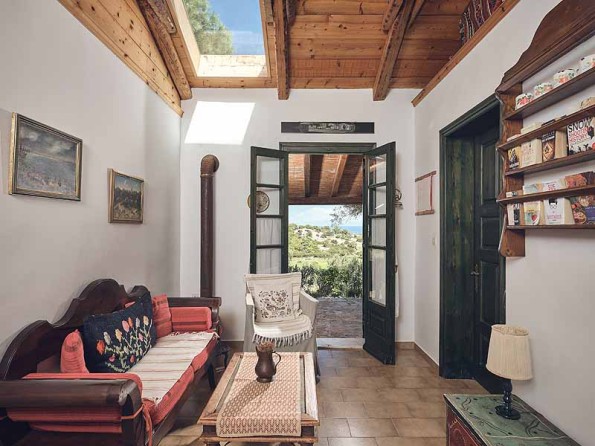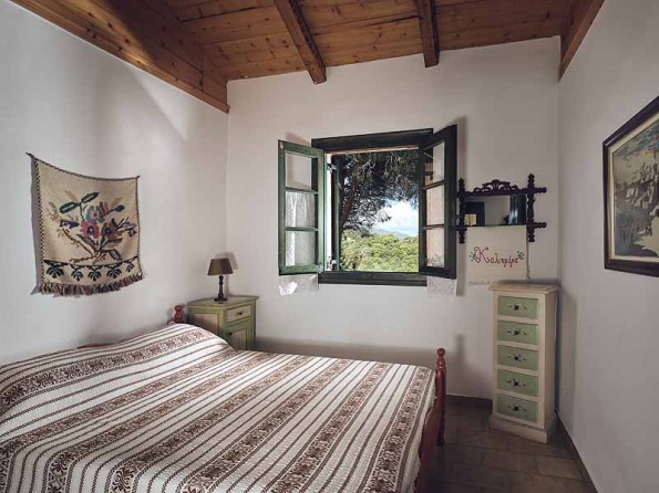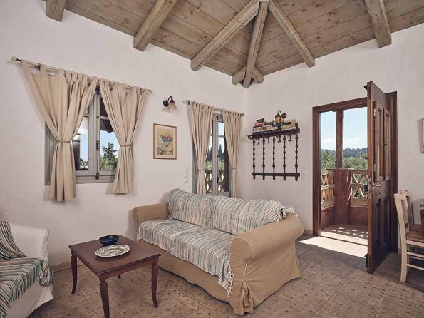 Agrili is set in the Rizes olive grove and can sleep up to five people. In its 80sq.m. it has two air conditioned bedrooms (1 double and 1 twin bedded), spacious sitting room with fireplace and extra bed for a fifth person, fully equipped kitchen (electric stove and oven, fridge-freezer, kettle, toaster, electric coffee pot) and bathroom WC. There’s also a washing machine and iron / ironing board. The house is cleaned and linen changed twice a week.