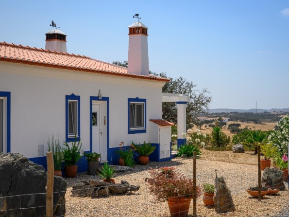 Situated on 40ha of private land, surrounded by its fenced-in garden and patio, two terraces with built-in BBQ. Views over fields with lots of ancient oak trees. At times the lake reaches right up to the property. The pool is set in a separate garden, 50m from cottage with a nice pergola, surrounded by nature with stunning views.Acres of rolling plains are home to the famous cork oak trees and, once known as the bread basket of Portugal, huge undulating acres of green turn to golden brown in the summer months as the grains ripen.