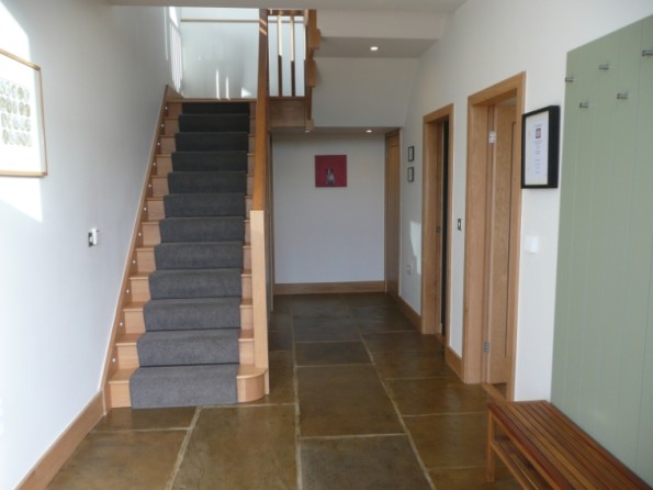 The ground floor comprises a large entrance hallway with stone flags, coat storage and boot drying facilities. The master bedroom has a kingsize 4-poster bed, flat screen TV with FreeSat, DVD player and iPod dock. The en-suite has a corner shower, WC, basin, heated towel rail and shaver point. Bedrooms 2 and 3 have either twin beds or super-king doubles and all bedrooms have oak floors and oak furniture, hairdryers and radio alarm clocks. The house bathroom has a bath/shower, WC, basin, heated towel rail and shaver point. The first floor comprises a huge open-plan space with lounge, kitchen and dining area, with bespoke LED lighting and a wood-burning stove. The kitchen is well-equipped with an extensive range of cupboards and granite worksurfaces. Facilities include a full-HD flat-screen TV with FreeSat-HD, Blu-ray DVD player, iPod/iPhone docking station, radio/CD player and free WiFi. There is a separate TV/reading room in the converted Stable, across the cobbled yard from the Barn. Solely for guests use it has comfy chairs & bean bags, a 55" smart TV and more great views over the valley from full-height windows.