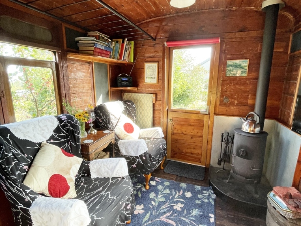 The van measures 24 by 8 feet and comprises a double bedroom, a galley kitchen with all the necessary facilities and a lounge diner with a wood burning stove, fireside chairs and a TV/DVD player and hi-fi. There is also a shower room and a flushing toilet. The carriage comes complete with free wireless broadband, electric heating, and an unlimited supply of logs for the burner – useful on those chilly nights!