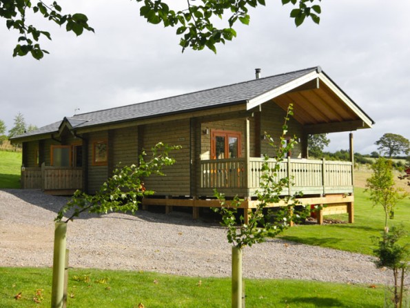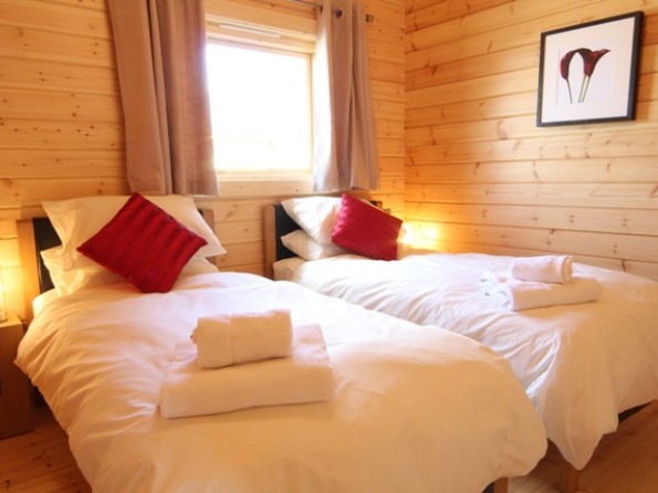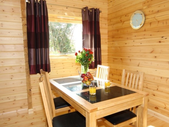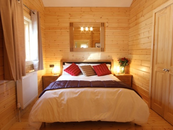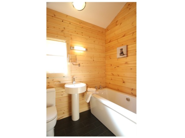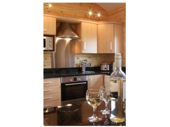 The cabin has two bedrooms – the main bedroom is ensuite with a large walk-in shower and both bedrooms have LCD televisions. There is a spacious lounge with a flat screen digital television, a DVD player, a real woodburner, and a HiFi with ipod docking station. The kitchen has a touch control halogen hob, oven, side by side fridge & freezer, dishwasher and washer/dryer and the cabin has central heating throughout. There is a fully fitted bathroom with full size bath, toilet and sink. This log cabin is finished with luxury fittings and facilities. A cot and high chair can be hired.
