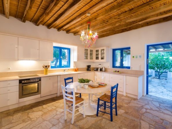 The three-bedroom villa, located approximately 5 km northeast of the seaside fishing village of Alyki, was designed as a classic island home with contemporary flair and comfortably sleeps six. Light and airy, the house has an inviting open floor plan, and is surrounded by wrap-around terraces. The space flows beautifully from the verandas with their various dining and lounging areas, to the interior shared living spaces and bedrooms. The huge veranda facing the sea is easily accessible from all of the rooms connecting to it, and the interior is kitted out with all of the modern conveniences from wifi to top-notch kitchen appliances and air conditioning and heating.