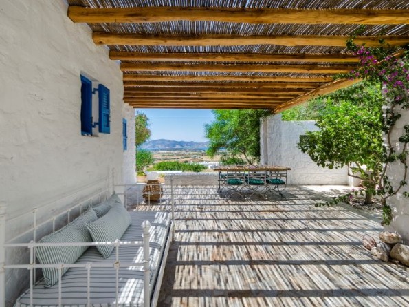 The Olive House offers its guests true seclusion and peace, and is surrounded by spectacular lavender and flowering gardens, and a small private vineyard. Visitors are likely to make a habit of sitting out on the vast flagstone veranda with a glass of wine watching the sun go down. Guests can also enjoy the spectacular views while dining outside at marble tables overlooking the Aegean and the neighbouring island of Antiparos.