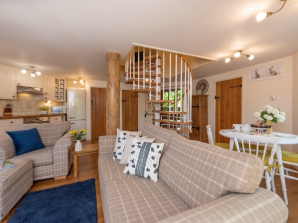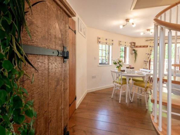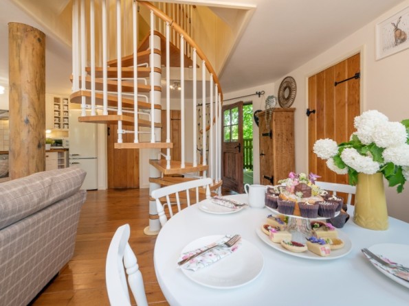 The fairy tale exterior of The Treehouse opens to reveal a spacious, sumptuous interior, carefully designed to accommodate a couple or a family of up to five in luxury. The simple, shaker style kitchen, with its beech worktop and Belfast sink compliments all that is natural and organic at The Treehouse. There is a comfortable dining area with a wonderful oak table next to a window. In the living area is a great wood burning stove designed to complement the under floor heating and add a focal point for those chilly evening after the hot tub! The comfy, squishy leather sofa is perfect for relaxing and a plasma TV with sky free view channels, I-pod dock and digital radio complete the area! There is a fabulous bathroom with a walk in shower.