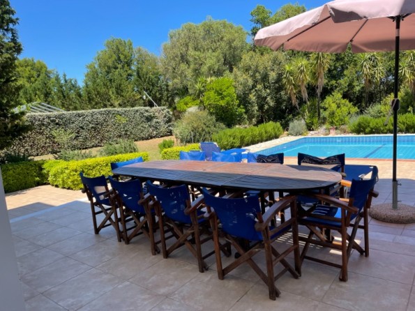 The accommodation is arranged on two floors. On the ground floor: three air-conditioned bedrooms, a bathroom, a shower room, large living space with a kitchen area, separate laundry/utility/cloakroom beyond. On the first floor: two bedrooms (both with balconies), large bathroom, two IKEA chair/beds (convert to double bed or two single beds) . Air-conditioning throughout. Large living/dining/kitchen area with balcon. Solar hot water system, full central heating and a wood burner on each floor. Weekly maid service, pool and garden fully maintained. Free Wifi, TVs, DVD players, CD players, books and games. Put-u-up bed and a cot available. Evening babysitting can be arranged if required.
