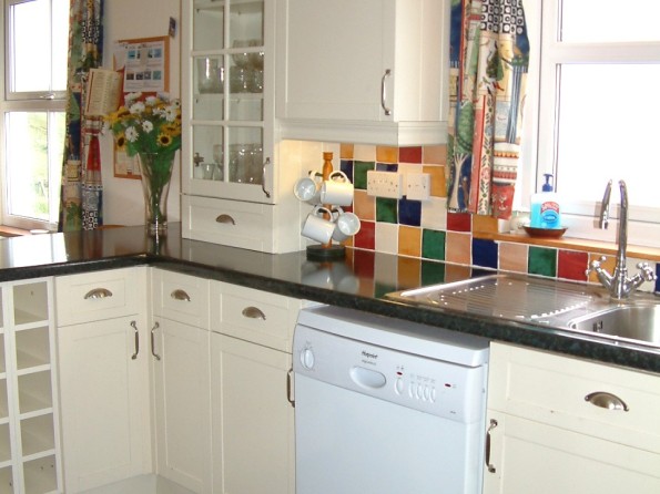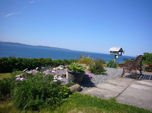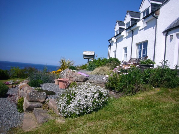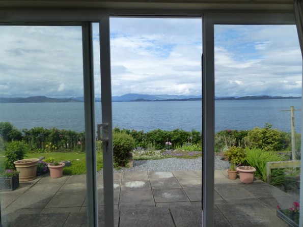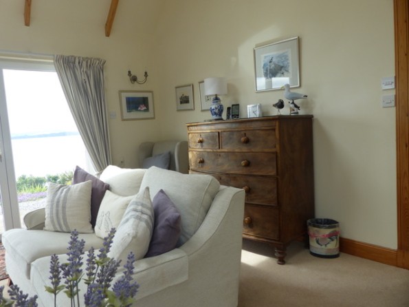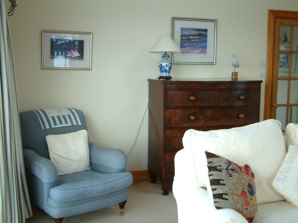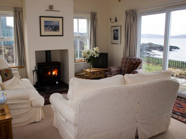 The house has four bedrooms - a double, a twin and a single upstairs (all of which have sea views) and a further double bedroom on the ground floor. There is a shower room upstairs and a bathroom downstairs. The dining room, with its Morso wood burning stove and oak dining table, provides sensational views through a large patio window, and the Shaker style kitchen is well equipped with everything you could need for efficient self-catering, including a selection of cookery books. The main living room has another wood burning stove and is furnished to a very high standard, with far reaching views from its huge windows.