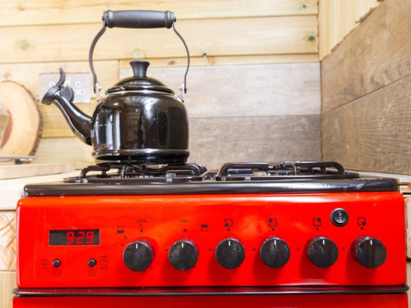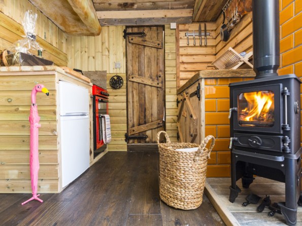 Inside this handcrafted wooden pod is warm, cosy and well equipped. There is a comfy king sized bed with a pocket sprung mattress, tucked into the framework of the pod with incredible views from the glass roof and sides. The woodburner and underfloor heating will ensure you are cosy, whatever the season. There’s a small kitchen area with gas cooker and fridge freezer, well equipped with crockery and utensils. At the far end of the cabin is a bathroom with toilet and shower. A stable door opens from the side into the garden.