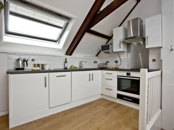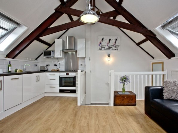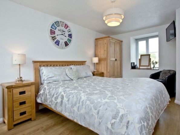Featuring an open-plan living arrangement on its top floor, Anchor Cottage is light-filled and spacious, with large windows lending an airy quality to the space, and dark timber trusses accentuating its modern décor. A roomy L-shaped sofa is the perfect place for relaxation and the crisp white colour scheme along with contemporary lighting add a touch of chic to the atmosphere. Amply equipped and well-designed the kitchen is ideal for whipping up anything from a simple breakfast to a delicious roast dinner, and homecooked creations can be shared and enjoyed together within the incorporated dining area. Downstairs, the cottage’s master bedroom features a comfortable king size bed with views out to the garden, creating a relaxing sanctuary in which to laze the mornings away. Treat yourself to coffee in bed or indulge in a lie-in or two; the slow pace of village life will have you unwinding from the moment you put your feet up.