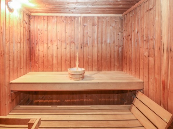 First floor: Spacious living room with feature log stove in centre separating sitting & dining areas. French doors to balcony with sea views. Quality fitted kitchen. Master double bedroom with dressing room & en-suite bath, shower over, basin & WC. Ground floor: Three bedrooms: 1 x family room with double & single bed, 2 x twin (one with TV). Bathroom with bath, separate shower, bidet, basin & WC. Additional basin & WC. Basement: Shower room with shower, basin & WC, 6-person sauna & spa pool.