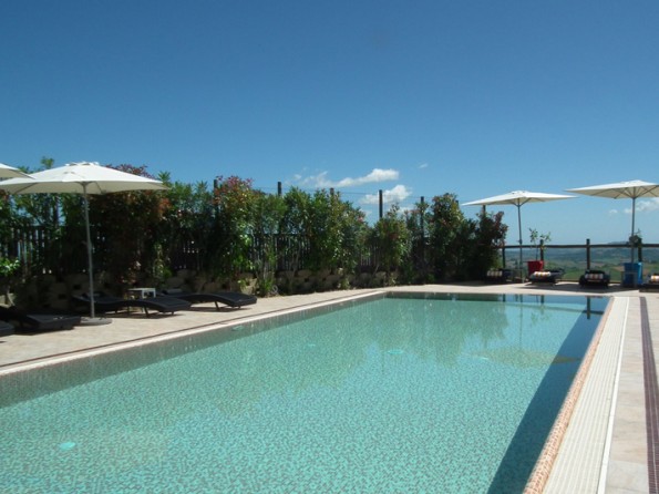 Externally stairs lead down to a privately fenced brick courtyard area with table, chairs and a gas Bbq and with expansive views across the rolling Le Marche countryside all the way to the azure Adriatic coast. It is attached to boutique Hotel Leone with unrestricted access to all its facilities and is only minutes walk to local supermarket, bank and post office in the town. Gated 12m x 5m shared infinity style swimming pool set in landscaped garden. Full pool-side drinks and food available throughout the day.