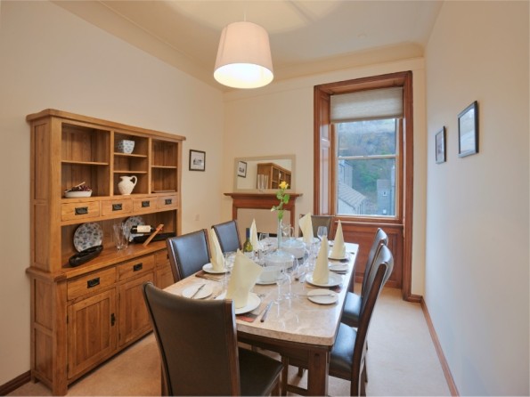 The apartment is situated on the third floor and is tastefully decorated throughout, with a seamless blend of period features and modern furnishings and comforts. There are three bedrooms – one double, one twin and one single – as well as a bathroom, a fully fitted kitchen, a large dining room with a decorative fireplace and a spacious lounge with a flat screen TV and DVD player.