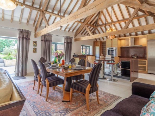 This property is the first of three interconnecting but separate barns. This luxurious barn provides a perfect location for a relaxing holiday on the Suffolk coast. Located near the Suffolk/Norfolk border with easy access to the many idyllic fishing villages and larger towns, guests will find everything from traditional seaside fares to romantic eateries. To the North, Gorleston offers a stunning bay with golden sand beaches and clifftop restaurants, further North is the seaside resort of Great Yarmouth with Sea World. Those harking back to childhood memories can enjoy the history and heritage of the fishing industry and wealth created by the sardine trade along the quayside. For a bit of candy floss and kitsch, the seafront provides illuminations, pier, promenades, arcades, funfair and a sandy beach. To the South, another traditional seaside town Lowestoft is just a few miles away and few miles beyond are the towns of Southwold and Alburgh which are a must visit for any stay in Suffolk. Take a trip inland to the magical waterways of the Norfolk broads or the many English Heritage sites that dot the landscape. Enter this fantastic barn through the side of the property where you walk through into a lobby area that has a separate WC and is also the perfect place to kick off your walking boots before heading into a wonderfully presented lounge/kitchen/diner with limestone floors, fabulous artwork bursting with character with its exposed original beams. The lounge area is perfect for you to enjoy some social downtime with three sofas that surround a Smart TV so you can stream or watch your favourite shows with loved ones. The chef in the group will love the space the kitchen offers when preparing culinary delights. As well as a gas oven and hob, microwave, fridge/freezer and dishwasher you have a kitchen island complete with three bar stools, should anyone want to grab a light snack or just watch you cook. The formal dining table can seat up to six people. If you prefer the experience of al fresco dining, then you can open up the patio doors conveniently located across the side of the open plan living area and serve food outside with ease from the kitchen. This property is located on the ground floor and offers three king size bedrooms each with an en suite shower room and WC. All bedrooms have patio doors that lead on to a patio area and come equipped with Smart TV's, wardrobes and drawers, and one with a walk in wardrobe. So lots of space to put your suitcases away. Outside is accessed via the French doors from the kitchen and here you have a communal courtyard with plenty of your own dedicated limestone constructed seating area surrounded by beautiful plants with a hot tub to soak away those tired muscles whilst stargazing in blissful surroundings. There is private off road parking for up to three cars.