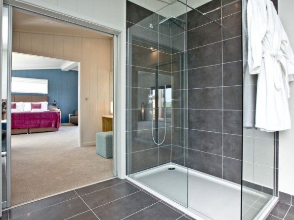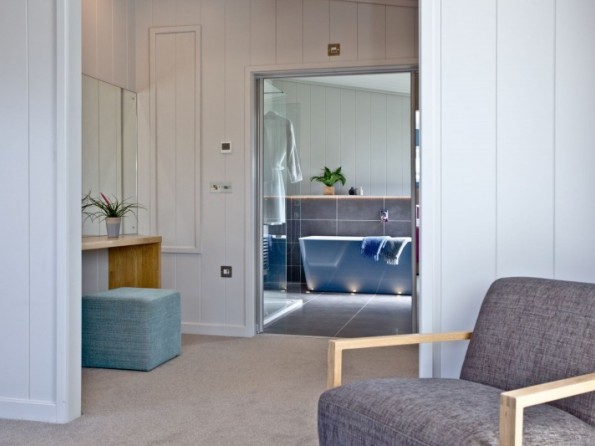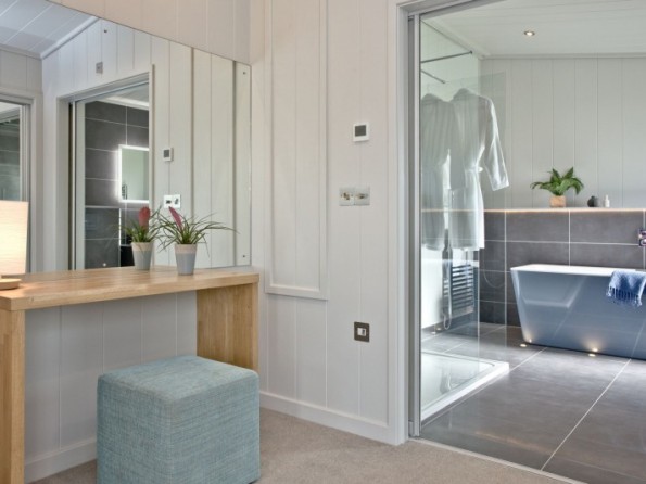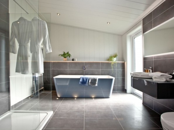 - Walk-in rainfall shower, freestanding bath with LED spotlights on the floor, wash basin, WC, heated towel rail, shaver point and mirror with motion-controlled lighting