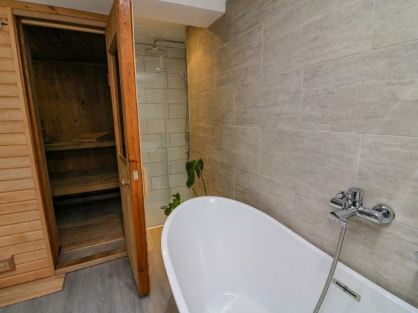 Three bedrooms: 1 x king-size double, 2 x double. Bathroom with two person bath, rainfall shower, basin, WC and sauna, first floor cloakroom. Kitchen/Diner. 2 x sitting rooms (one with sofa bed).