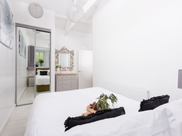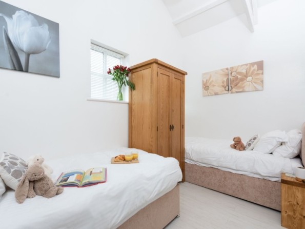 The second bedroom has the same very high ceilings and exposed roof timbers and is furnished with twin beds, pedestal table and a wardrobe
