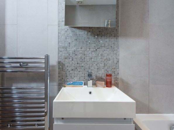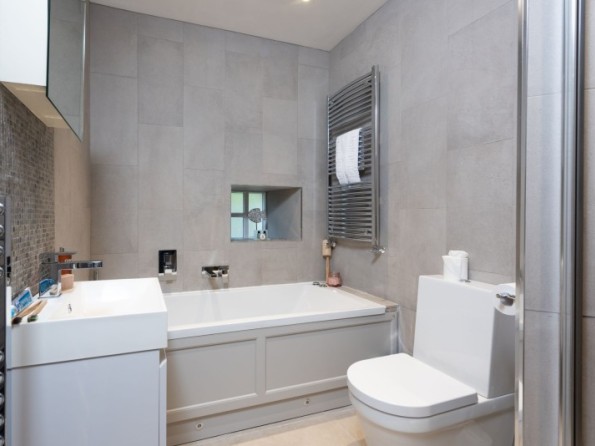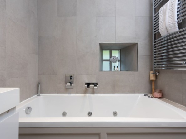 This generous bathroom features a whirlpool bath and separate shower, a hand basin and cabinet with electric mirror, heated towel rail and WC