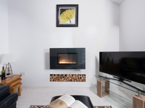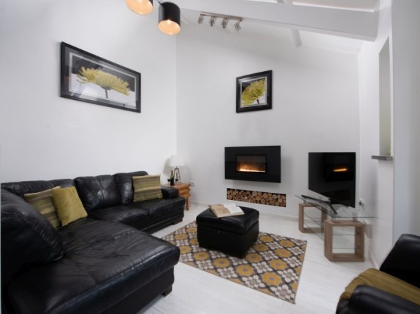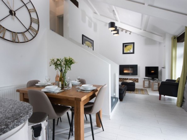 On the ground floor and open plan with the kitchen / dining area. Vaulted ceilings and exposed stone lend drama to the space which is furnished with a leather corner sofa, armchair and matching footstool as well as a 43 inch Samsung 4K Ultra HD Smart TV Ruark Deluxe Smart speaker. A gas fire with log store creates the room’s focal point
