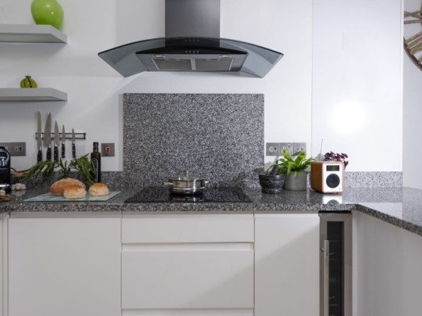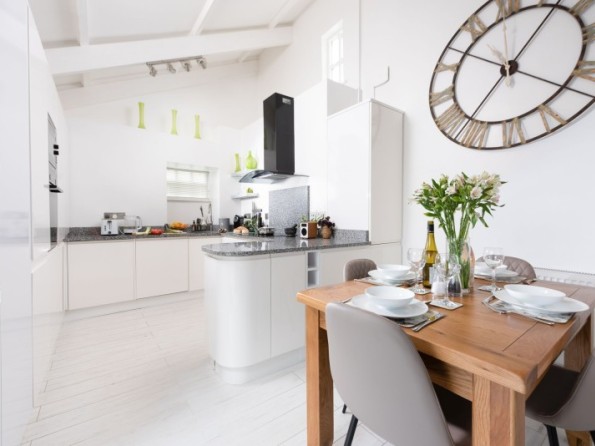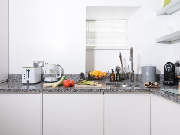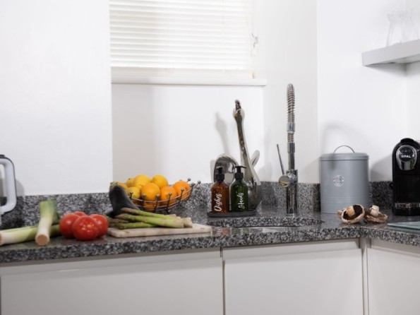 On the ground floor and open plan with the living room and dining area, the stylish fitted kitchen with granite worktops, electric cooker, combi microwave/oven/grill, fridge/freezer, dishwasher, Opal coffee machine (compatible with Nespresso-style pods), kettle, toaster, washer/dryer, iron, ironing board, vacuum cleaner and Vileda Mop