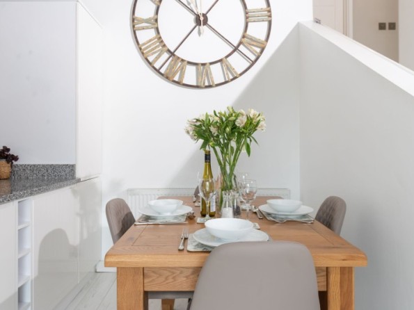 Open plan with the kitchen and lounge, the dining area is furnished with a table and four chairs