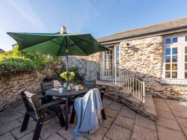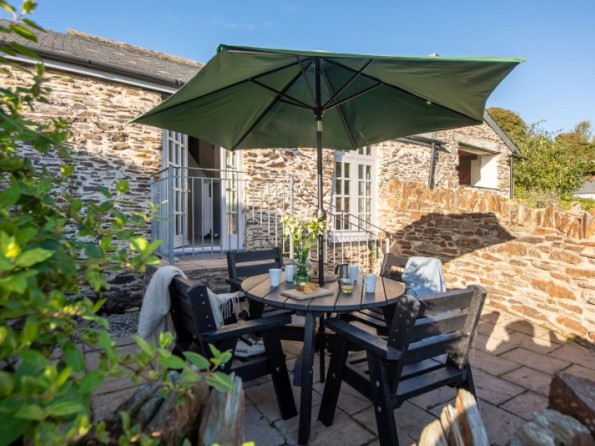 A private, enclosed courtyard garden with paving lies to the front of the cottage and is furnished with a table and four chairs.