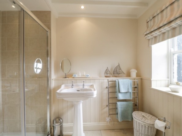 Bathroom with underfloor heating, double shower cubicle, hand basin and WC.