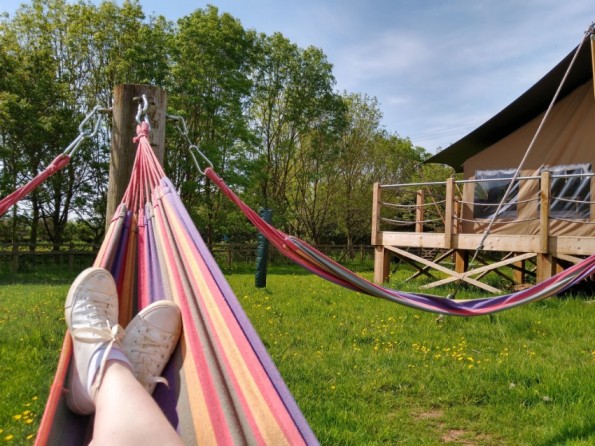 This safari tent has two fenced deck areas and four hammocks, as well as a firepit / BBQ area area, comfy seating, picnic table and a wood fired hot tub. It also has amazing views to Exmoor National Park. You can't see the play areas from these lodges so they're lovely for couples glamping, or families with older children. The hot tubs are an optional extra which you can select when booking. They are large hot tubs, perfect for up to six guests. The tents are right on the edge of Exmoor International Dark Sky Reserve so the hot tub is the perfect place to relax and watch the shooting stars on a clear night!