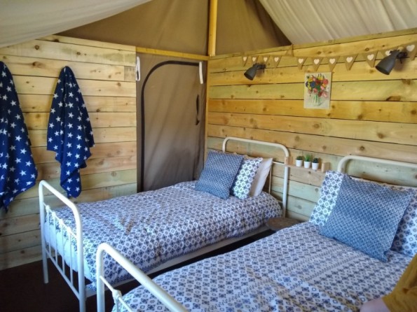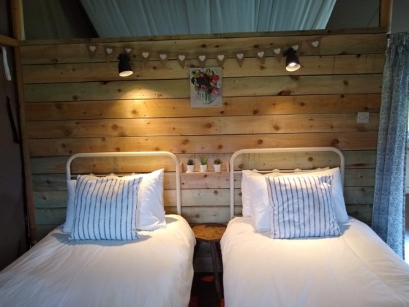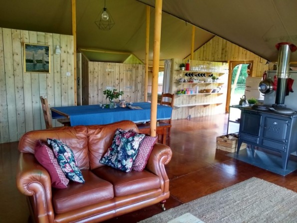The tent can sleep up to six people and has three bedrooms - a king room, a twin room, and a quirky double cupboard bed which the children will LOVE! It is the largest of the six safari tents on the farm and even has a playroom! There’s a private and spacious bathroom accessed via the king or the twin room. It is divided in two, with a basin and flushing loo on one site, and on the other side a large shower room with a water heating stove. There is also a second, separate, loo. Cooking and heating are via the large wood-burning stove in the heart of the tent and lots of firewood is provided. The kitchen is well equipped with crockery, cutlery, pots and pans etc. There’s a small fridge freezer and an electric hob if you want to heat something up quickly without using the wood stove. There’s a large table and chairs with ample space for everyone. The sitting area has comfortable seating for chatting and relaxing. There’s LED lighting and a couple of electrical sockets where you can charge a phone or laptop. Although there’s no WiFi, there’ a good 4G signal on the farm if you need to stay connected.