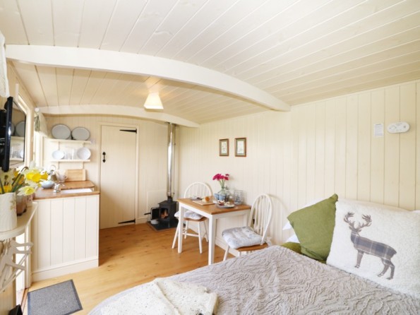 Studio accommodation with double bed, kitchen and dining area with woodburner. Shower room with shower, basin and WC.
