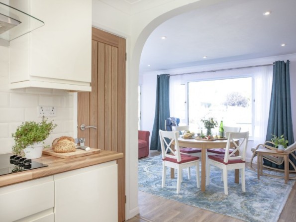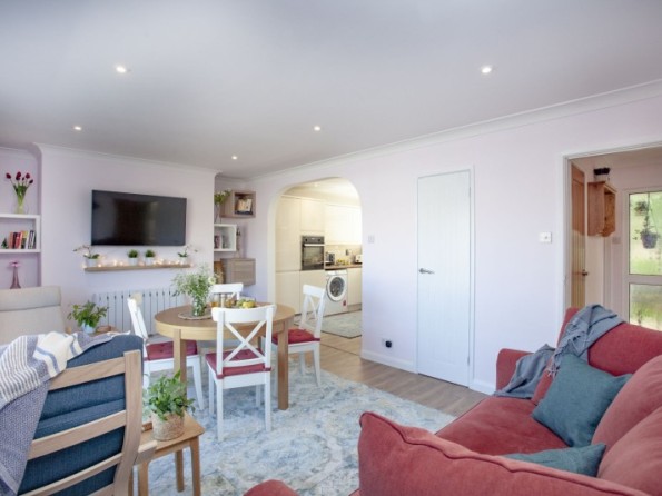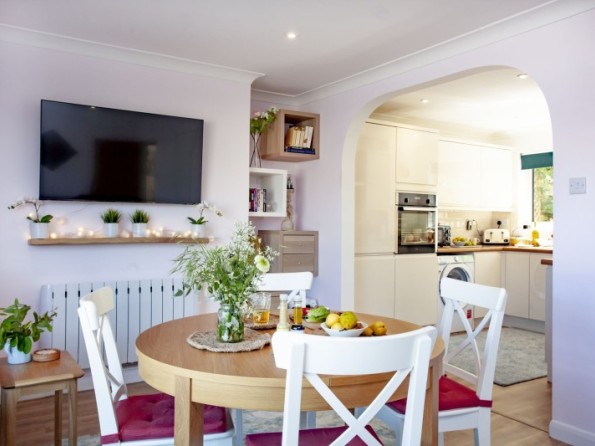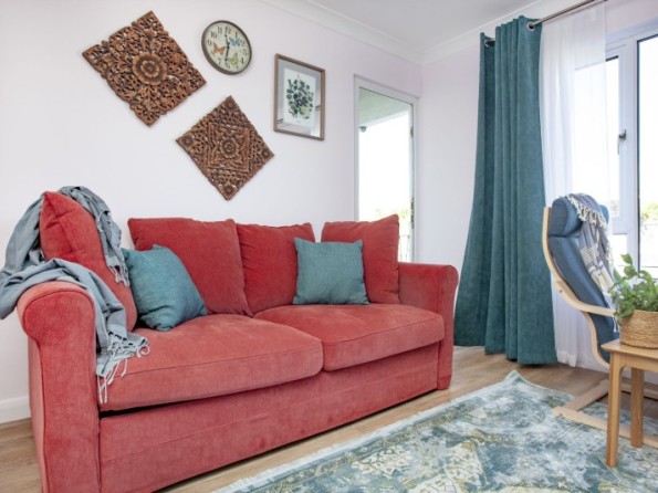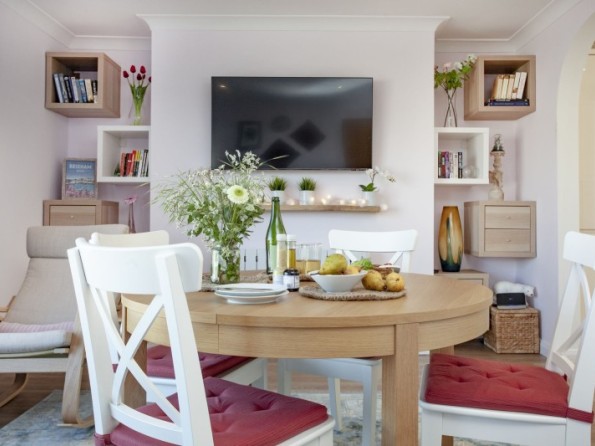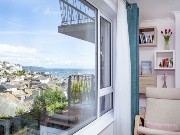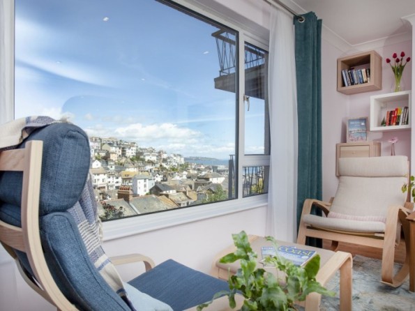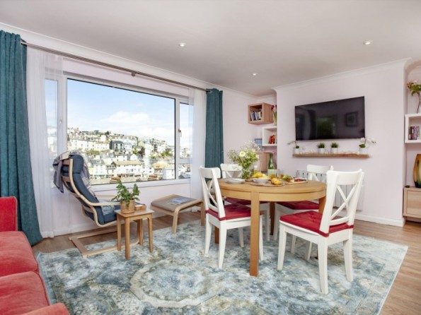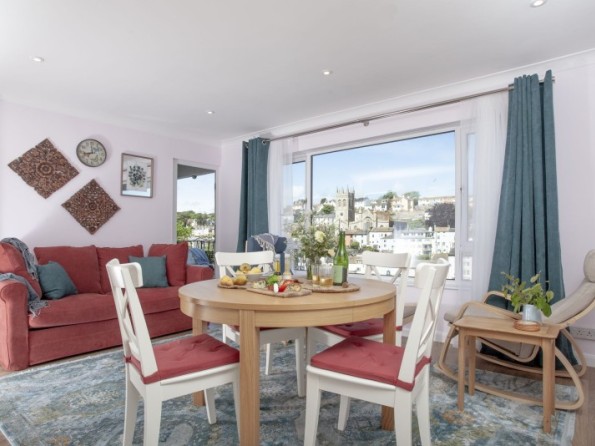 Open plan with the kitchen and dining area with views from All Saints Church across to the harbour, marina and bay. The room is furnished with two armchairs and a table that are positioned right at the window, a Smart flat screen TV with apps like Netflix and Amazon Prime available, footstool, side tables and bookshelves