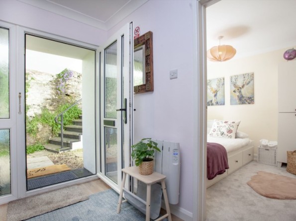 This apartment has its own private entrance from Mount Pleasant Road. There are steps immediately down from the apartment to Fore Street
