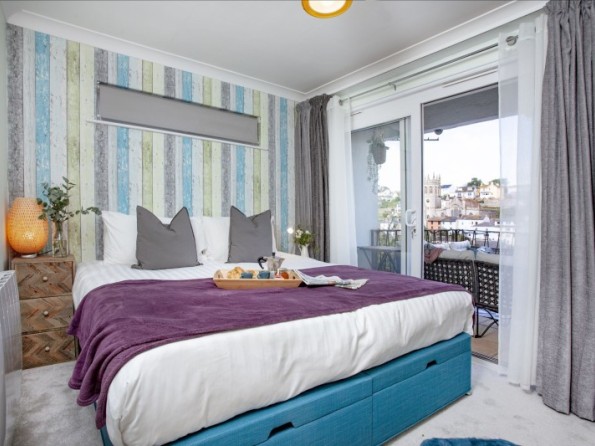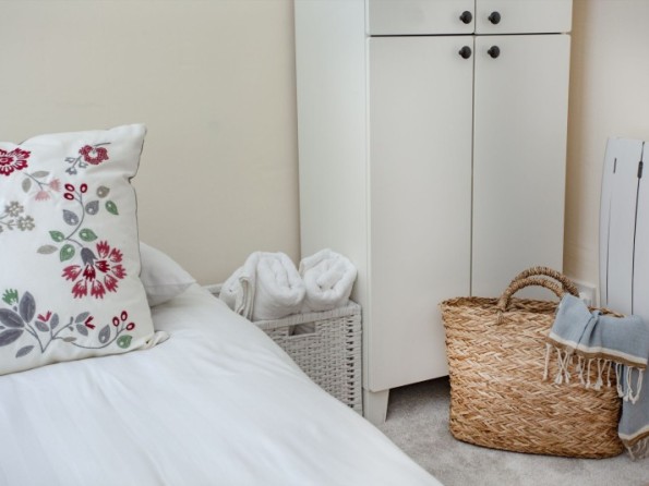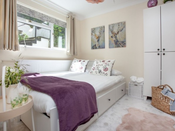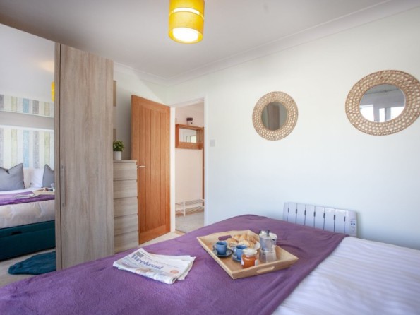 The master bedroom has access directly out to the patio and has wonderful views over the town and out to sea. Furnished with a super king size bed, stand-alone wardrobe, bedside tables and lamps, a mirror and chest of drawers