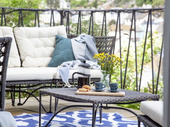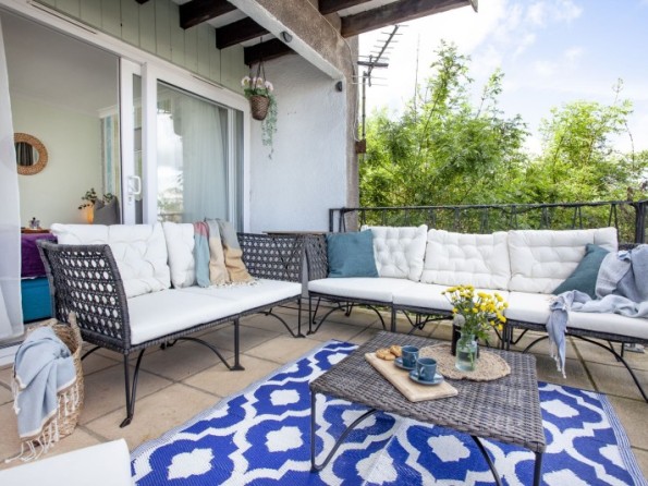 The spacious terrace / balcony features a tiled floor and an outdoor suite of table, two armchairs and a sofa. There are stairs down from the terrace to the lower-level private garden which enclosed and laid to lawn