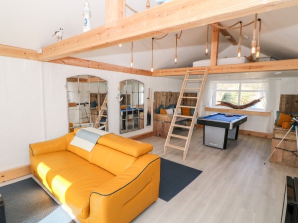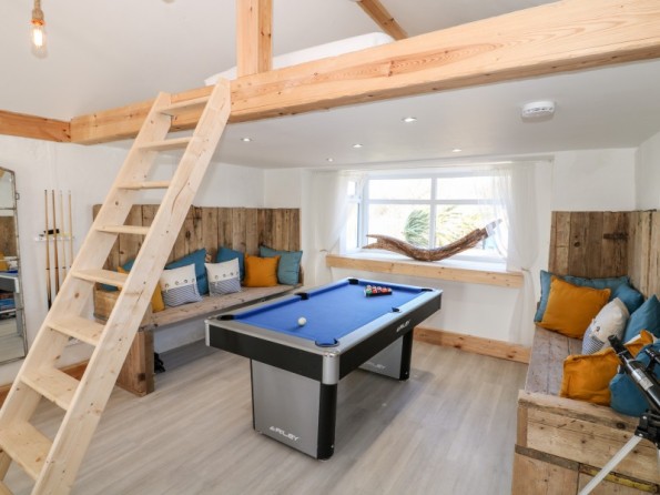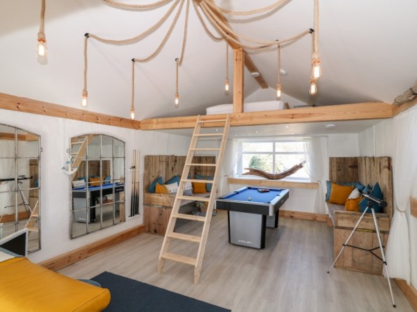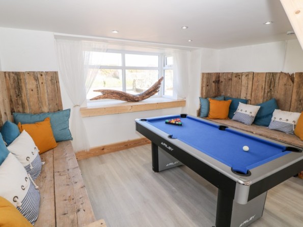 All ground-floor. Two bedrooms: 1 x Kingsize, 1 x twin (zip/link, can be super-king-size on request). Bathroom with bath, shower over, basin and WC. Open-plan living space with kitchen, dining area and sitting area with woodburning stove. Utility room. External games room with woodburning stove