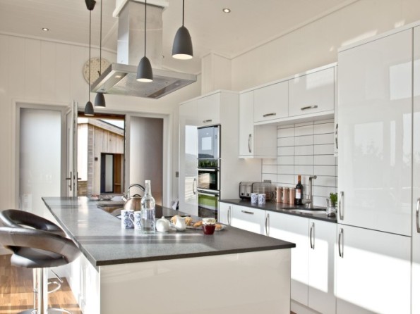 Modern gloss units with a built-in single electric oven with warming tray and gas hob, built-in microwave, fridge freezer, dishwasher, wine cooler, induction kettle, toaster and cafetière