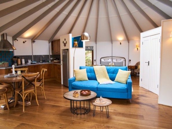 This collection of treehouses, shepherds lodges and an iconic 1950s American Airstream is set in the most idyllic rural setting, in a wooded valley on the outskirts of the waterside village of Dittisham in Devon and is just perfect for UK glamping breaks and unique stays. Dog friendly (with the exception of Buzzard Treehouse). The hideaway is surrounded by lush greenery and woodland wildlife, and each accommodation has its own private space and a wood fired hot tub. Dartmouth is a 10 minute drive, and you can choose between heading inland to enjoy the rural landscapes, or head to the coast for beaches and coast paths.